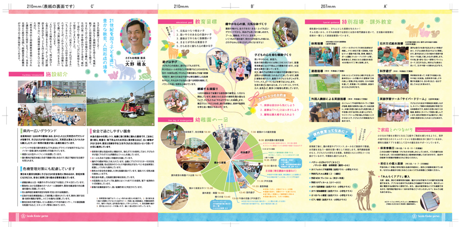 【紙媒体の統括】入園案内の制作実績。取材を通してクライアントの意向を汲み取り、撮影からテキスト提案、レイアウト、印刷まで全てゼロから提案・制作。(6面巻き三つ折り仕様/画像は中面)