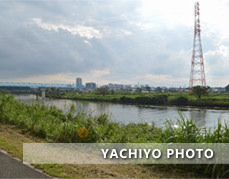 新川のサイクリングロードから。八千代中央駅付近のマンション群が、川辺の自然の奥に並びます。こんなに緑豊かな風景が隣合っているなんて、街の中にいると忘れてしまうけれども。