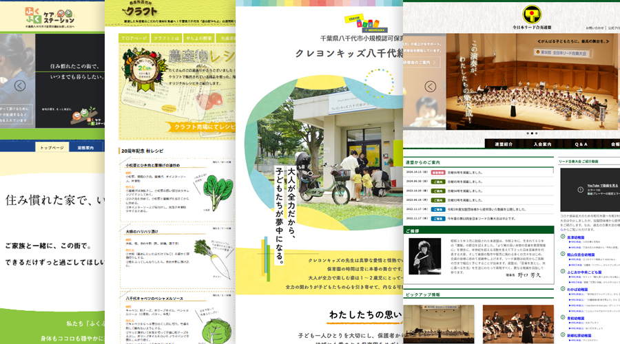【クライアントワーク】フリーランス時代は社会福祉法人ふくふくケアステーション様、クレヨンキッズ緑が丘園様はじめ、さまざまな業種のクライアント様からご依頼いただき、素材制作、デザイン、コーディング、維持管理まですべて一人で行う。